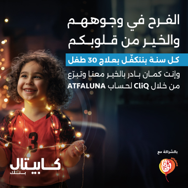 في إطار استراتيجيته للمسؤولية الاجتماعية المؤسسية، والتزامه الراسخ بدعم القضايا الإنسانية، جدد كابيتال بنك شراكته مع مؤسسة "أطفالنا" للعام الرابع على التوالي، من خلال التكفل بتكاليف العلاج الطبي لـ 30 طفلاً الذين يحتاجون إلى الرعاية الطبية بمختلف أشكالها.